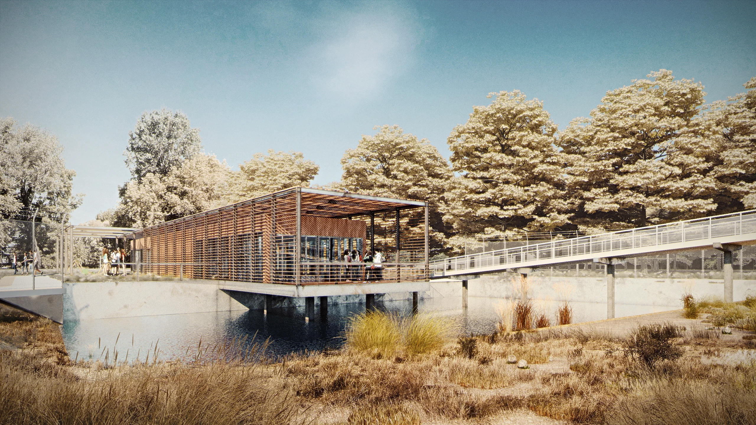 A látogatói útvonalra és a tórendszerre felfűződő négy épület azonos formai koncepció szerint készült. Minden épület rendelkezik egy zártabb épületmaggal, melyet egy könnyedebb rácsburok vesz körül. A rácshéj szerepe az árnyékolás, illetve az épületek tömegeinek oldása, könnyítése. Ahol az épületmagokon belül elhelyezett funkciók megkövetelik, a rácshéj felnyílik. A megnyitások területei napvitorlákkal árnyékoltak. A látogatói útvonalról leváló gondozóház épületén kívül minden épület kommunikál az új vízfelületekkel, közelebb hozva a látogatókat az állatokhoz. A fogadóépület esetében egy nagyméretű terasz, a rendezvényház esetében a multifunkciós terem, az étteremnél pedig a kültéri fogyasztótér nyúlik be a kifutók területére. A rendeletben meghatározott védőtávolságok az épületek és a magasösvények tervezése során kiemelten figyelembe voltak véve.